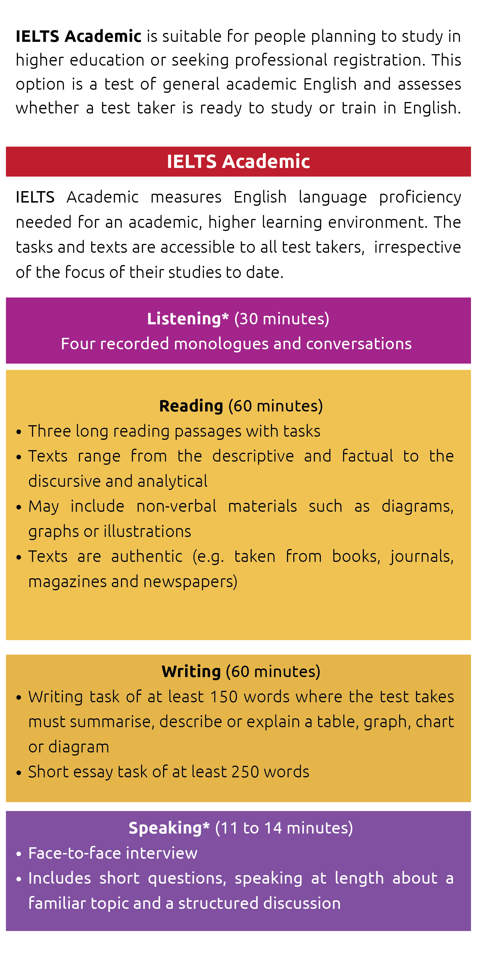 IELTS for StudyIELTS Academic is suitable for people planning to study in a higher education or seeking professional registration. It assesses whether a test taker is ready to begin studying or training in the medium of English. Making effective use of written texts in academic work is a skill to be acquired at college or university, not one that students at all levels should be expected to possess on entry. For this reason, IELTS Academic testing reflects some features of academic language but does not aim to stimulate academic study tasks in their entirety. This approach is widely supported by the institutions that recognise IELTS. IELTS General Training is suitable for test takers planning to train, undertake work experience or study below degree level in English-speaking environments. IELTS is also a requirement for migration to some countries. The IELTS partners work to help university admissions departments and other test users better understand the complex relationships between English language proficiency and subsequent academic success. This includes building awareness of key influences on academic outcomes and other factors, such as provision of ongoing language and study skills and support for international students.