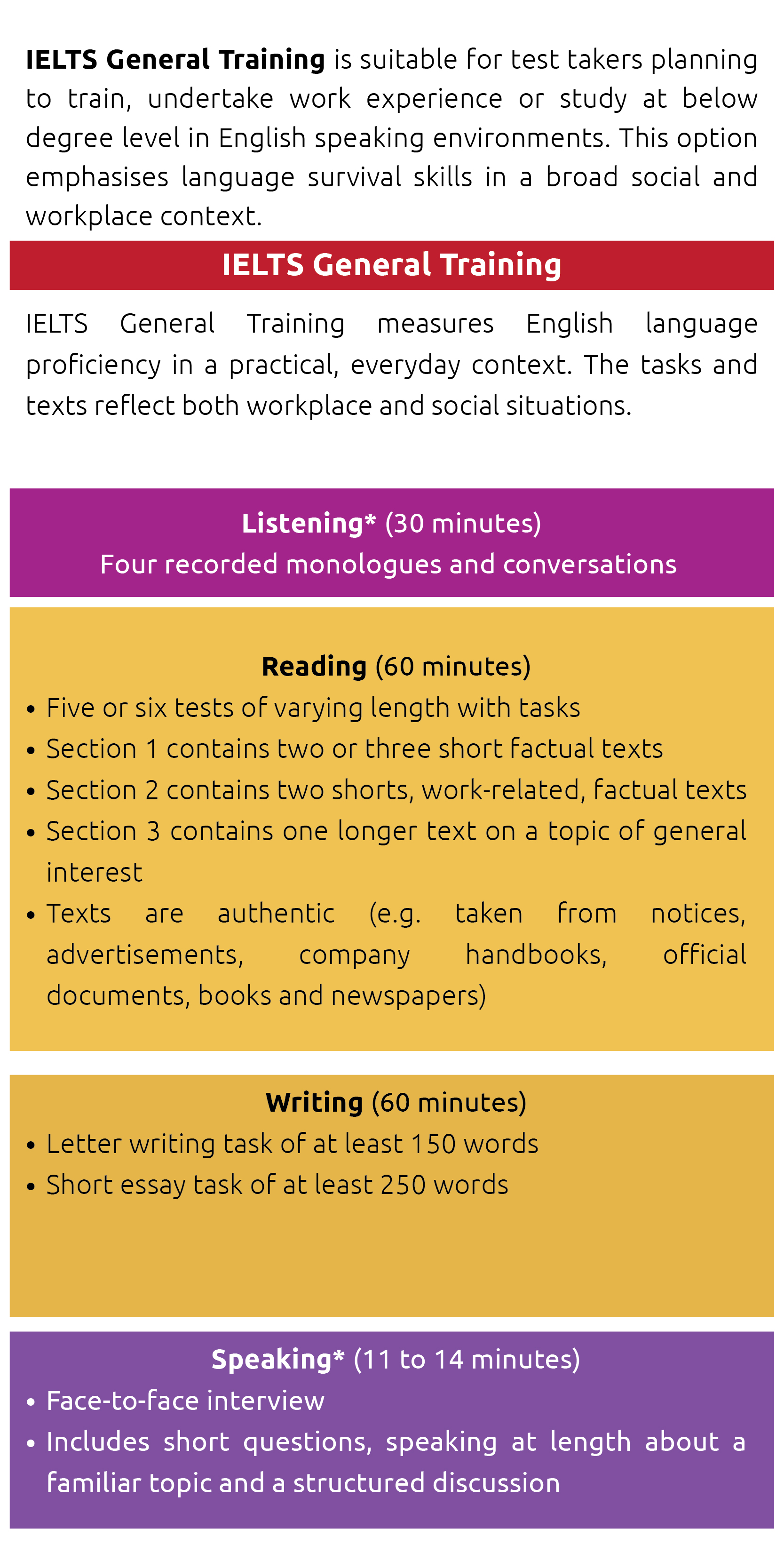 Test takers can choose between two test – IELTS Academic or IELTS General Training.